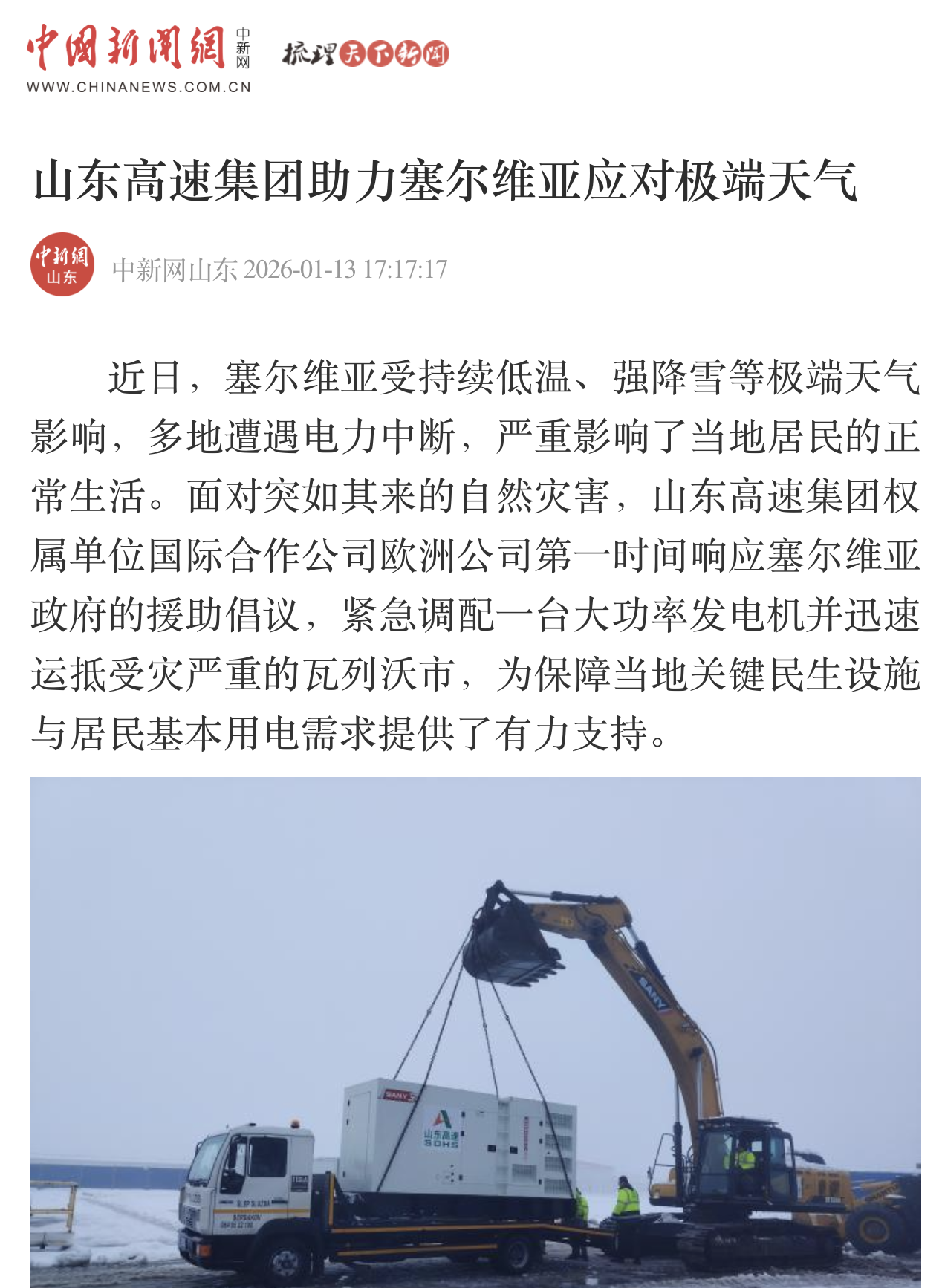 【中国新闻网】山东高速集团助力塞尔维亚应对极端天气