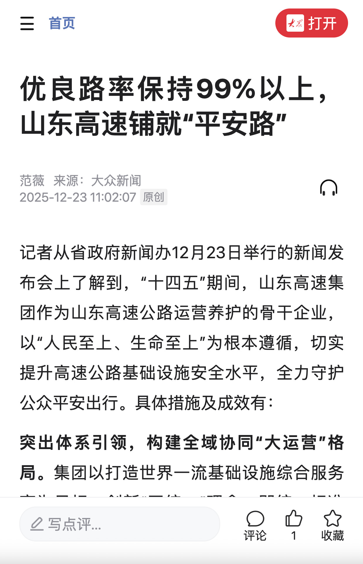 【大众新闻】优良路率保持99%以上,山东高速铺就“平安路”